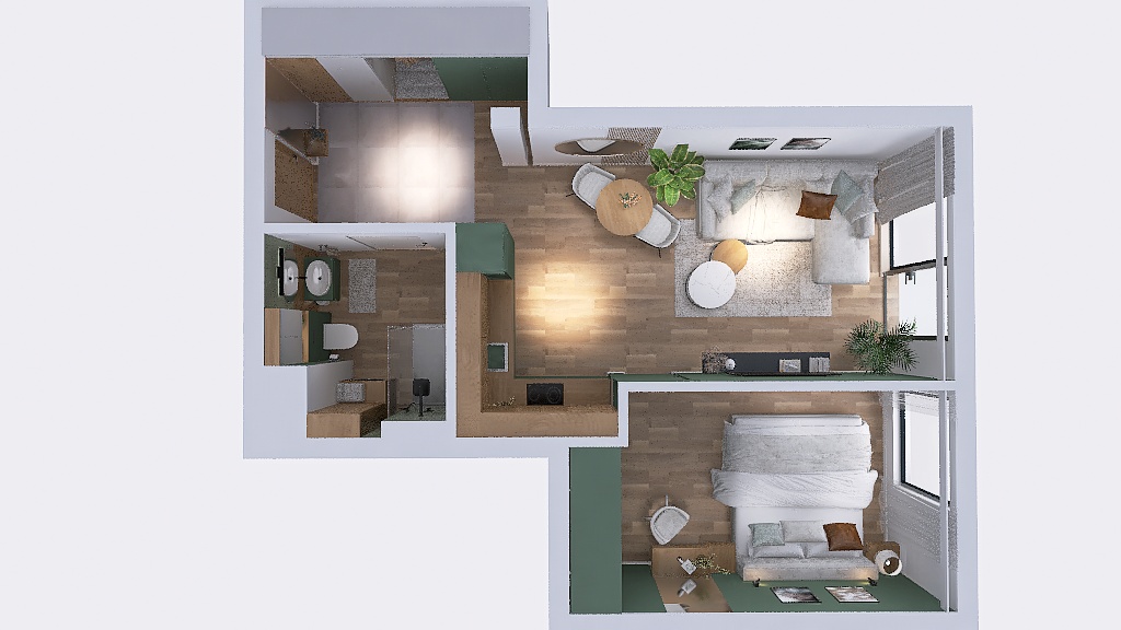 We wnętrzu dominują jasne barwy i naturalne materiały – drewno, biel i miękka zieleń – które tworzą atmosferę świeżości i równowagi. Zieleń pojawia się zarówno w detalach meblowych, jak i w dodatkach, stając się znakiem rozpoznawczym całego projektu.