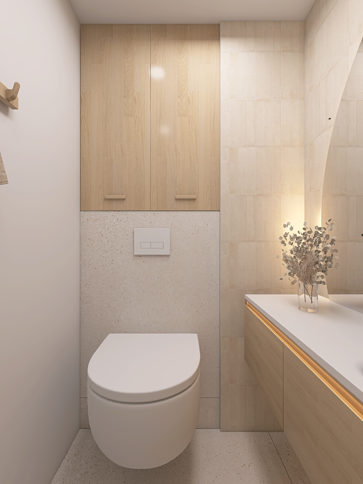 W łazience pojawia się łagodna gra światła i zaokrąglonych form. Oświetlenie LED podkreśla miękkość detali, a ciepły odcień drewna i beżowych płytek tworzy przyjazną, relaksującą przestrzeń.
